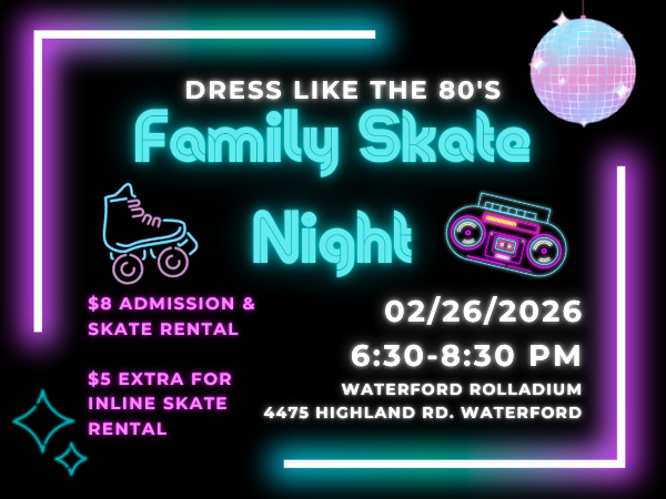 Break out the neon, leg warmers, denim jackets, and big hair because we’re throwing it back to the 80’s on February 26, 2026 from 6:30 to 8:30 pm at Waterford Rolladium. Join us for a night of fun, community, and totally rad vibes at the rink. Admission and skate rental is $8, with inline skate rental available for an additional $5. Anyone who shows up dressed in their best 80’s gear will receive a FREE dress coupon. We can’t wait to see your retro style. You won’t want to miss it! -
