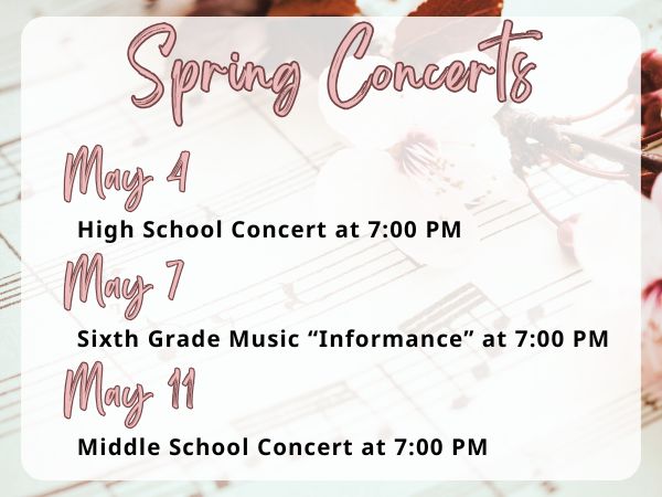 Join us for an evening of music at our High School Band, Choir, and Orchestra Concert on Monday, May 4 at 7 PM. Come enjoy the talent and hard work of our students!